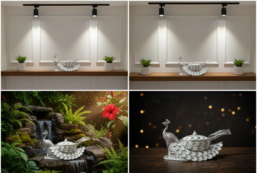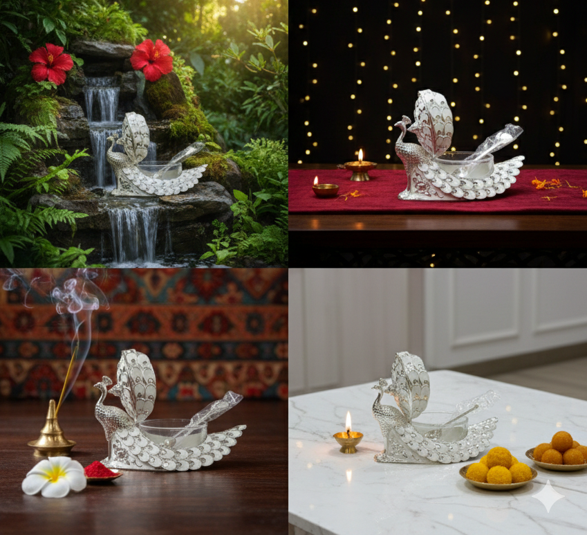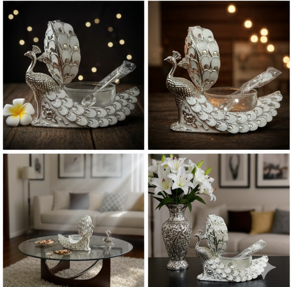 Apne ghar ko ek shahi aur adhyatmik (spiritual) ehsas dein is khoobsurat Silver Peacock Incense Burner ke saath. Ye sirf ek dhup-dani nahi, balki kala ka ek behtareen namuna hai jo aapke ghar ki sundarta mein chaar chand laga dega. Khaas Baatein (Key Features): Shahi Design: Iske bariki se tarashe gaye chandi jaise chamakdar pankh aur more ki banawat ise behad premium banati hai. Multipurpose Use: Ise aap dhup ya agarbatti jalane ke liye use kar sakte hain, ya phir isme apne keemti gahne (jewelry) aur pooja ki samagri rakh sakte hain. Majboot aur Tikau: High-quality finish ke saath banaya gaya hai, jo lambe samay tak apni chamak barkarar rakhta hai. Best for Gifting: Shadi, saalgira (anniversary), ya Griha Pravesh ke liye ye ek perfect aur yaadgaar gift hai.