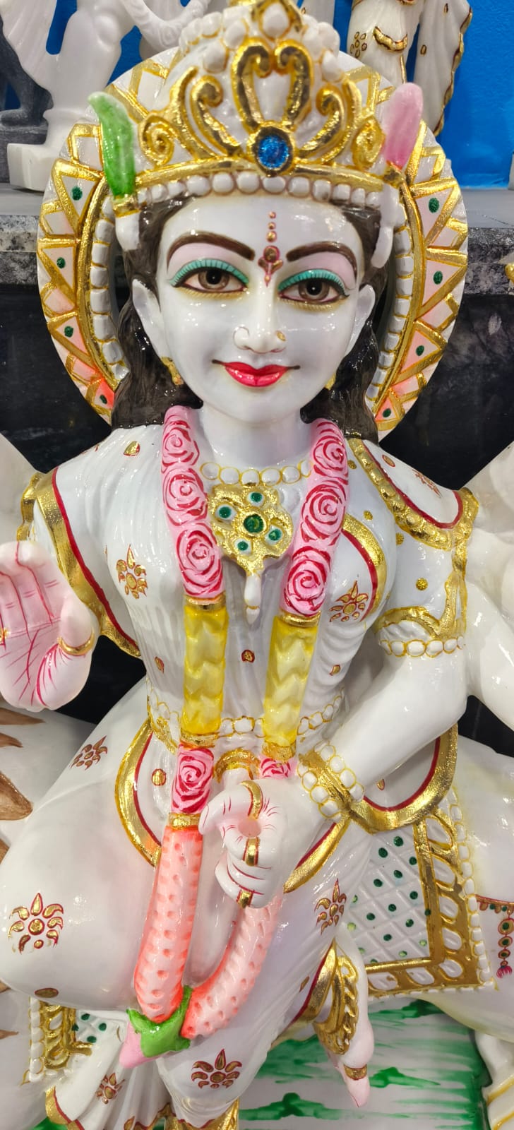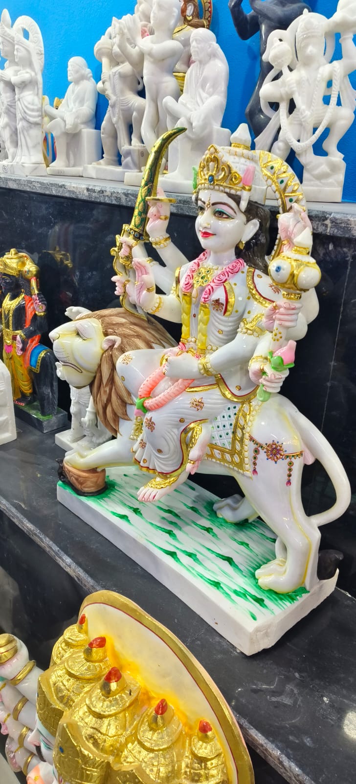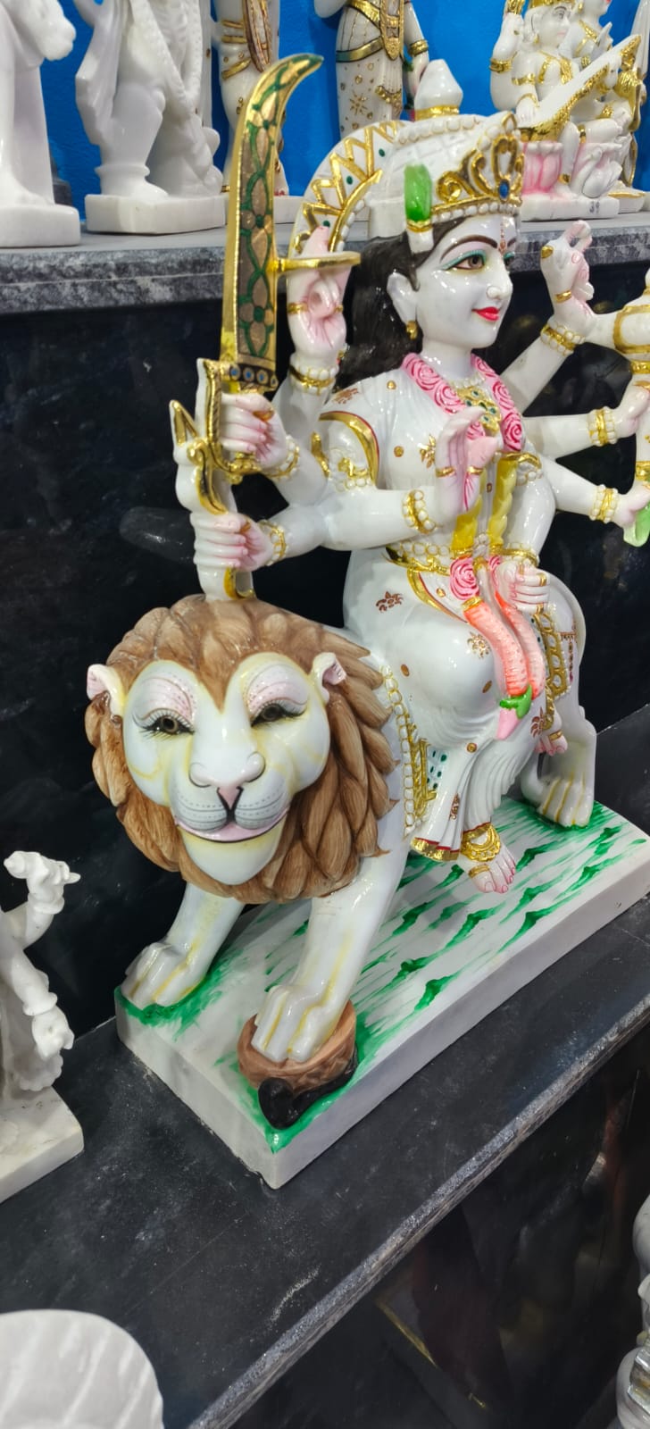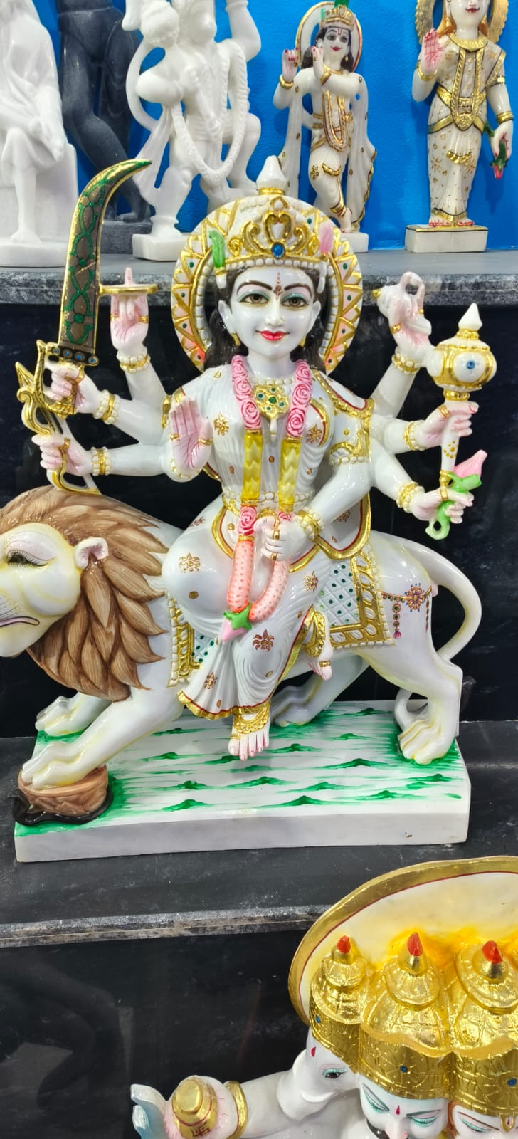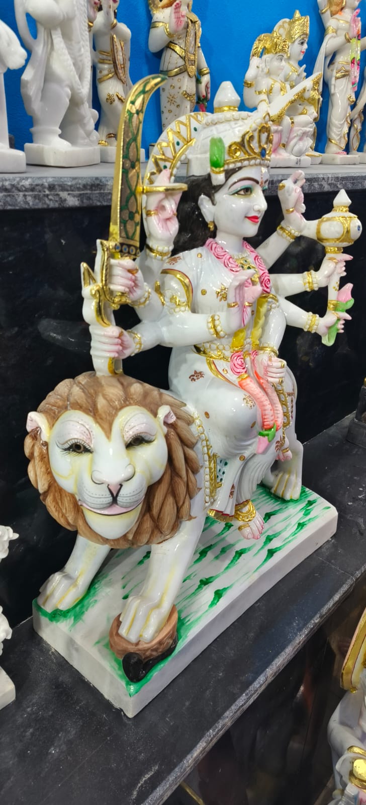 यह एक सुंदर और आकर्षक मूर्ति है जिसमें मां दुर्गा को दर्शाया गया है। मां दुर्गा शेर (सिंह) पर सवार हैं, जो शक्ति और साहस का प्रतीक है। उनके कई हाथ हैं, जिनमें अलग-अलग अस्त्र-शस्त्र दिखाई दे रहे हैं, जैसे तलवार। एक हाथ आशीर्वाद देने की मुद्रा में है, जो भक्तों के प्रति उनकी कृपा को दर्शाता है। उन्होंने सिर पर सुनहरा मुकुट, गले में फूलों की माला और सुंदर आभूषण पहने हुए हैं। मूर्ति का रंग-सज्जा बहुत बारीक और आकर्षक है, जिसमें सफेद, सुनहरा और हल्का गुलाबी रंग प्रमुख हैं। यह मूर्ति शक्ति, सुरक्षा और बुराई पर अच्छाई की जीत का प्रतीक है, और आमतौर पर पूजा या सजावट के लिए उपयोग की जाती है। 🙏