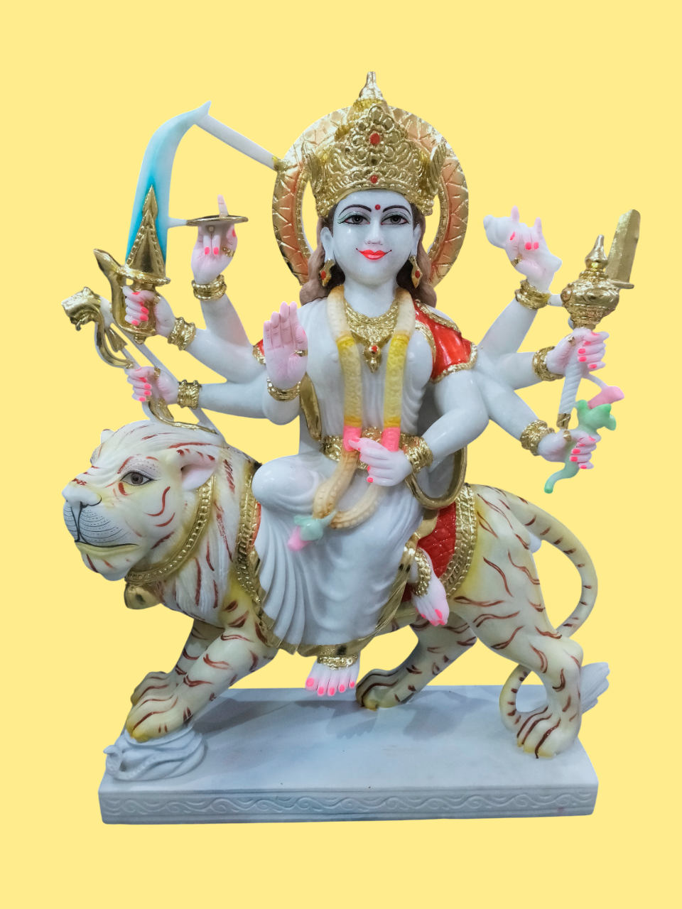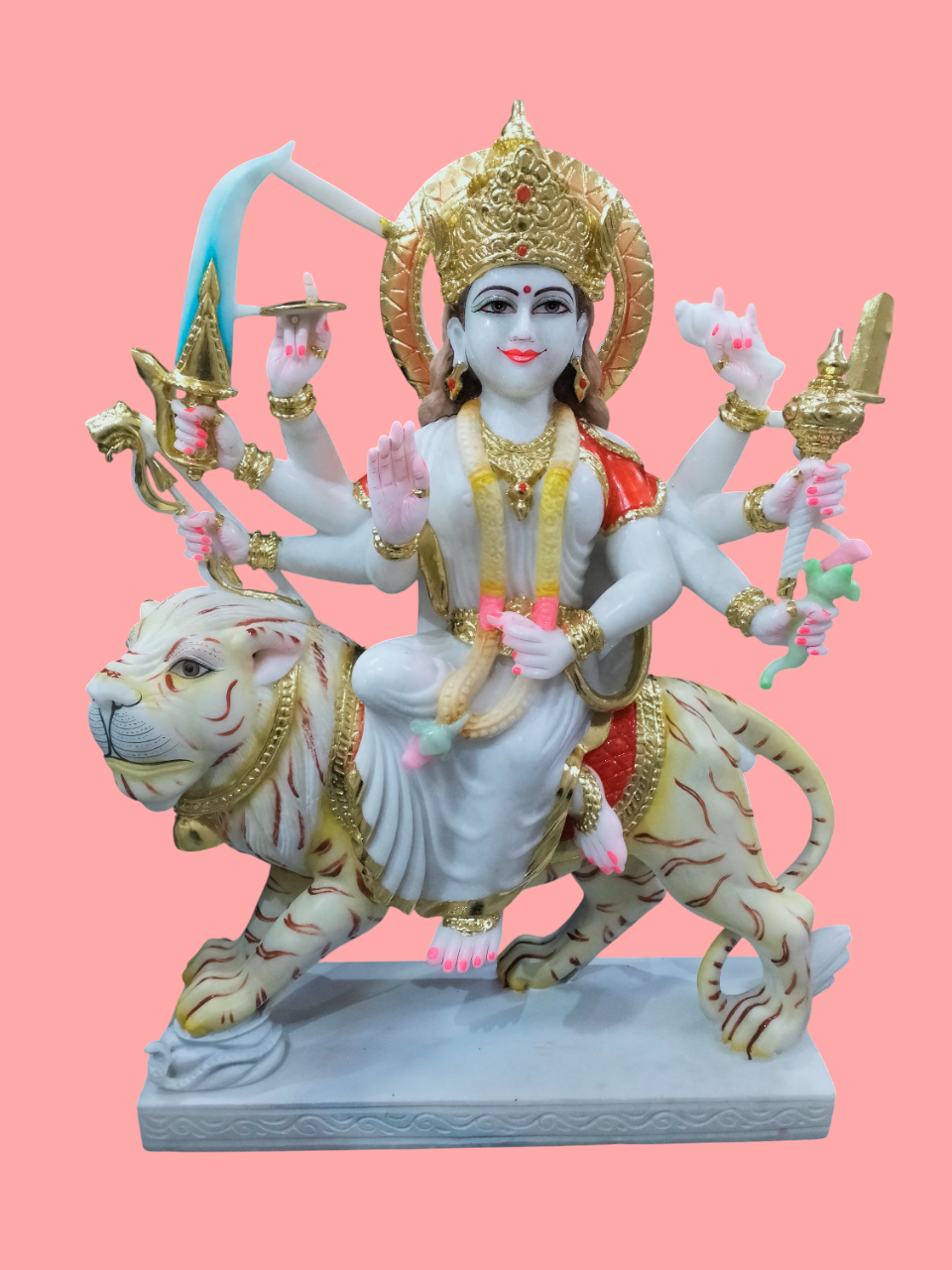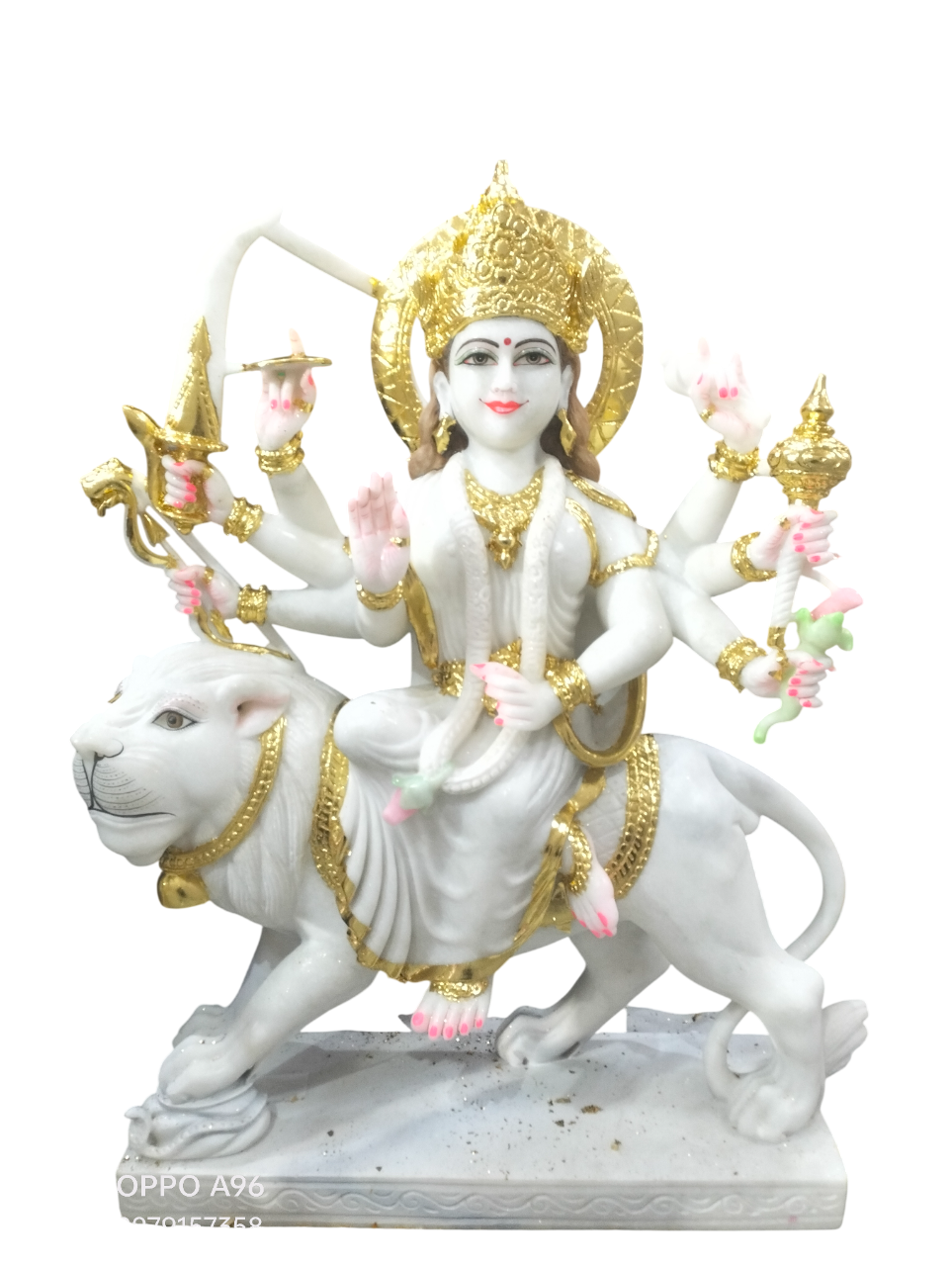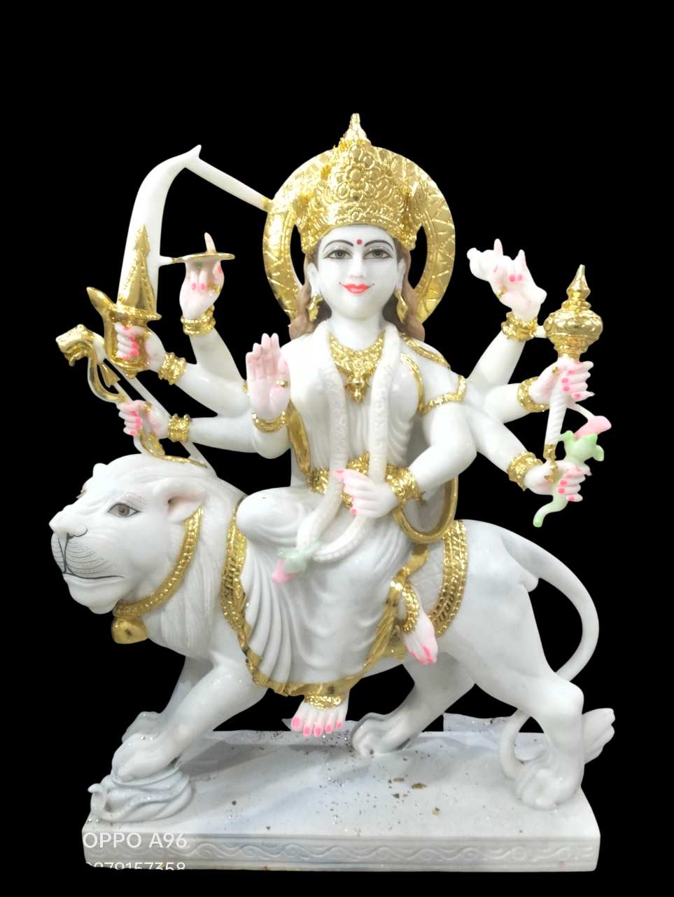 Apne ghar mein sukh, samridhi aur suraksha lane ke liye sthapit karein Maa Durga ki yeh bhavya marble murti. Safed sangmarmar se bani yeh pratima Maa ke "Sherawali" roop ko darshati hai, jo burai par achai ki jeet ka prateek hai. Divine Look: Maa ke chehre par ek saumya muskan aur ankhon mein karuna hai, jo bhakt ko shanti pradan karti hai. Symbolism: Maa apne vahan (Sher/Lion) par virajman hain aur unke hathon mein shastra (Trishul, Talwar, Dhanush) shakti ka bodh karate hain. Perfect For: Navratri poojan, Home Mandir, aur Office entrance. 2. Artistic & Decorative (Design Focus) Title: Premium Hand-Painted Marble Maa Durga Idol Description: Yeh murti kushal karigari aur sundar rangon ka ek adbhut mishran hai. High-quality marble par ki gayi gold aur vibrant colors ki painting ise ek royal look deti hai. Detailing: Murti mein Maa ke gehne, mukut, aur Sher (Lion) ki body par ki gayi detailing bahut hi barik hai. Finish: Glossy finish ke saath marble ki thandak aur mazbooti ise salon-saal tak naya banaye rakhti hai. Colors: Ismein gold, laal aur hara rang ka prayog kiya gaya hai jo traditional Indian art ko darshata hai.
