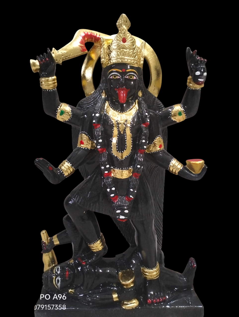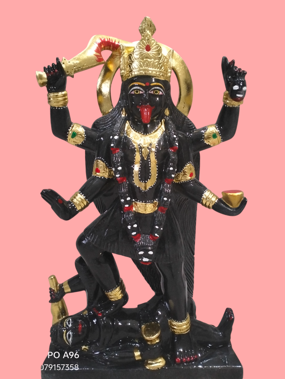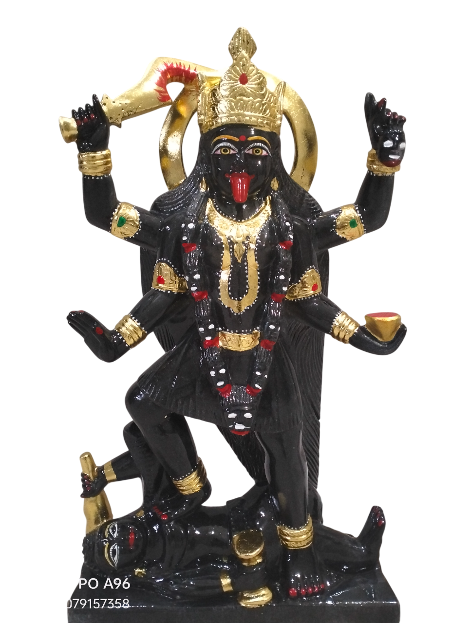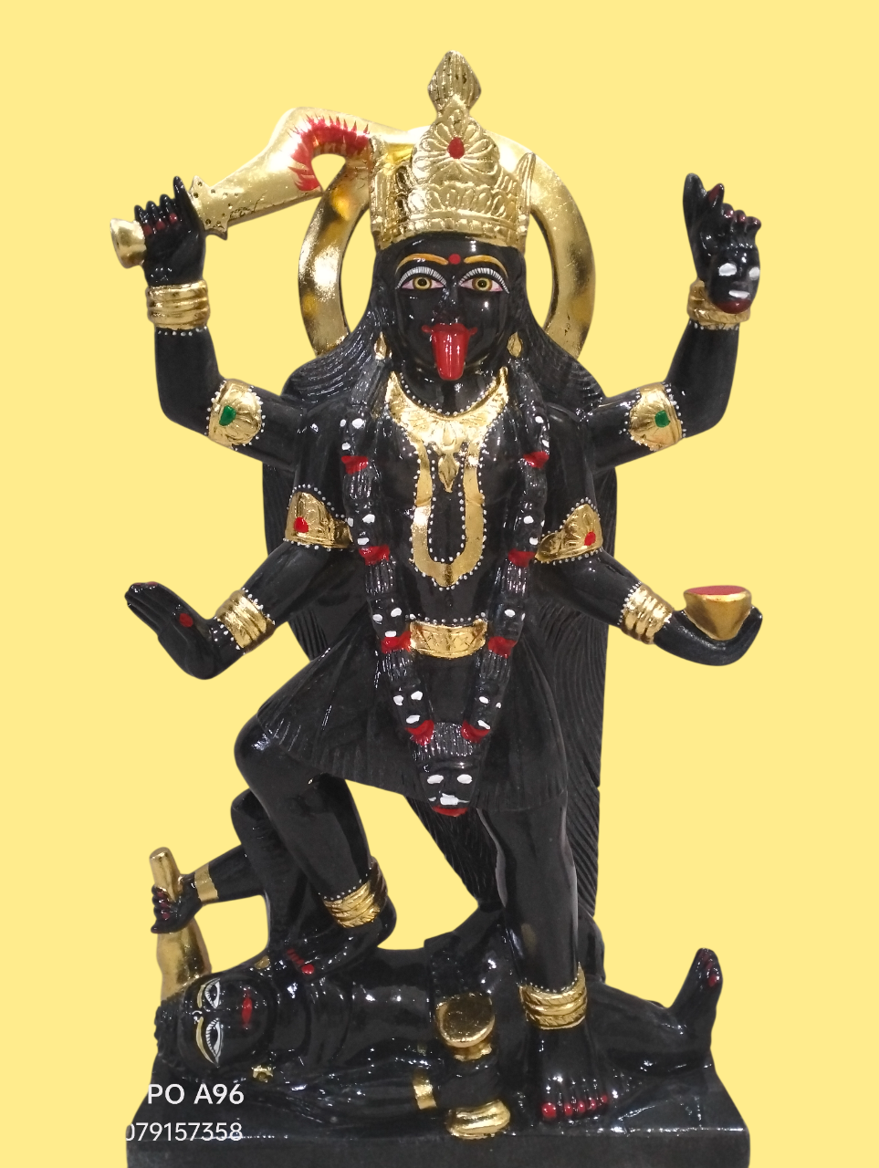 Adharma ka nash aur bhakton ka kalyan karne wali Maa Kali ki yeh murti shakti ka sakshat prateek hai. Is pratima mein Maa ko unke parampari swaroop mein darshaya gaya hai—khule kesh, gale mein mundmala, aur Bhagwan Shiv ke upar virajman mudra. Divine Detailing: Maa ke hathon mein Khadag (talwar) aur asur ka sir behad bariki se tarasha gaya hai, jo burai par achai ki jeet ko darshata hai. Gold Work: Murti par kiya gaya Premium Gold Paint aur gahnon (jewelry) ki nakashi ise ek rajasi aur bhavya look deti hai. Aura: Yeh murti ghar mein dush-shaktiyon ko door rakhne aur sahas pradan karne ke liye sthapit ki jati hai.