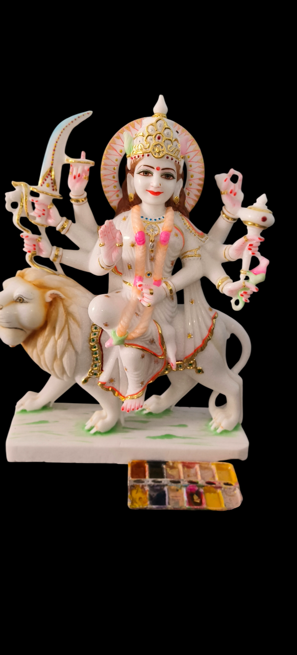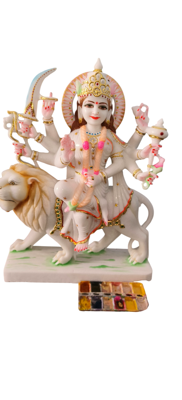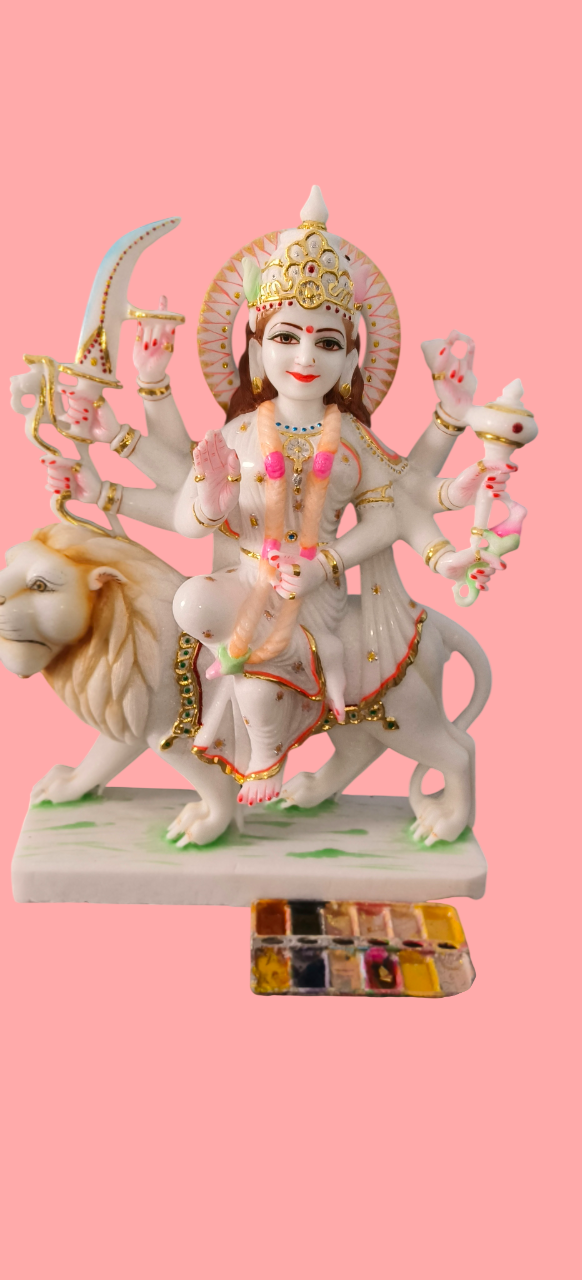 Apne ghar mein sukh-samridhi aur suraksha ka aagman karein is bhavya Maa Durga ki murti ke saath. Yeh pratima premium quality ke safed marble (white marble) se bani hai aur kushal karigaron dwara hath se tarashi gayi hai. Swaroop: Maa Durga ko unke majestic "Ashtabhuja" (8 haath) roop mein darshaya gaya hai, jo apne vahan Sher (Lion) par virajman hain. Art Work: Is murti mein Premium Gold Foil aur vibrant rangon ka prayog kiya gaya hai, jo Maa ke shringar aur vastron ko ek royal aur divya look deta hai. Details: Maa ke hathon mein shastra (Trishul, Talwar, Dhanush) aur unke chehre par saumya muskan burai par achai ki jeet ka prateek hai. Vibe: Yeh murti ghar ke mandir mein sakaratmak urja (positivity) aur shakti ka sanchar karti hai.