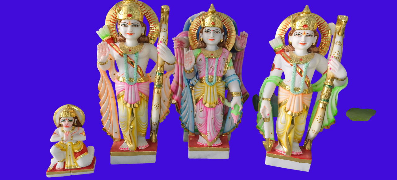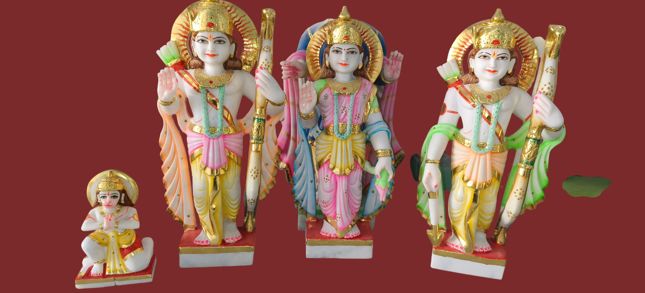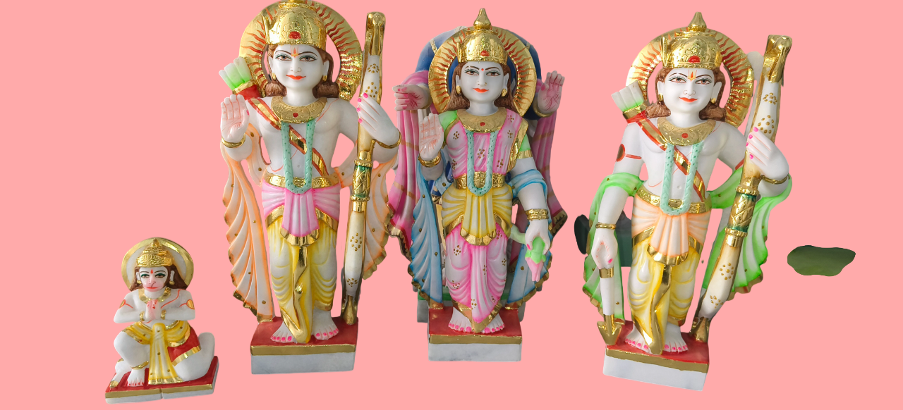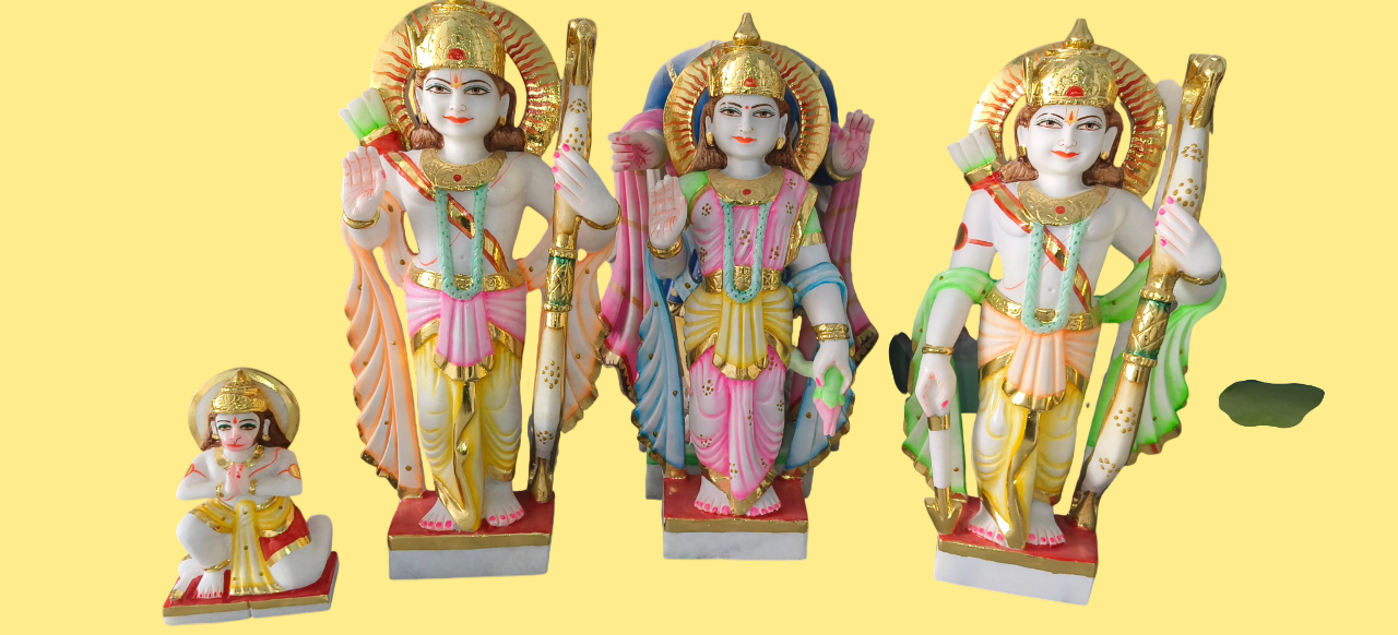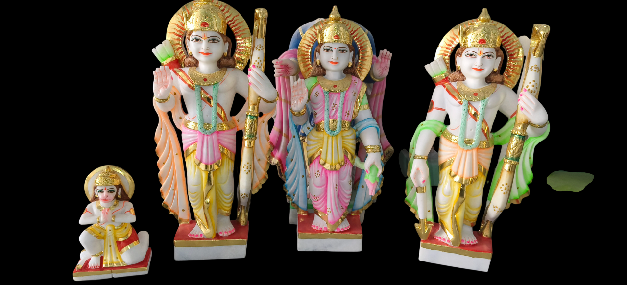 Apne ghar mein Ayodhya ka ashirwad layein is sundar Ram Darbar murti set ke saath. Is set mein Prabhu Shri Ram, Mata Sita, Lakshman Ji aur bhakt Hanuman Ji ki pratimaein shamil hain. Yeh pure white marble se bani hain aur in par bahut hi sundar rangon ka kaam kiya gaya hai. Details: Prabhu Ram aur Lakshman Ji ke hathon mein dhanush, Mata Sita ki saumya chhavi, aur Hanuman Ji ki bhakti-bhav mudra ko bahut hi bariki se darshaya gaya hai. Art Work: Har pratima par sunhari (gold) finish aur vibrant rangon ka prayog kiya gaya hai jo inhein ek royal look deta hai. Vastu Benefit: Ram Darbar ko ghar mein rakhne se parivarik ekta aur shanti bani rehti hai